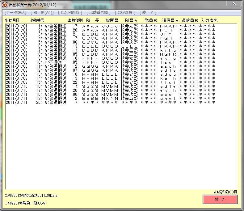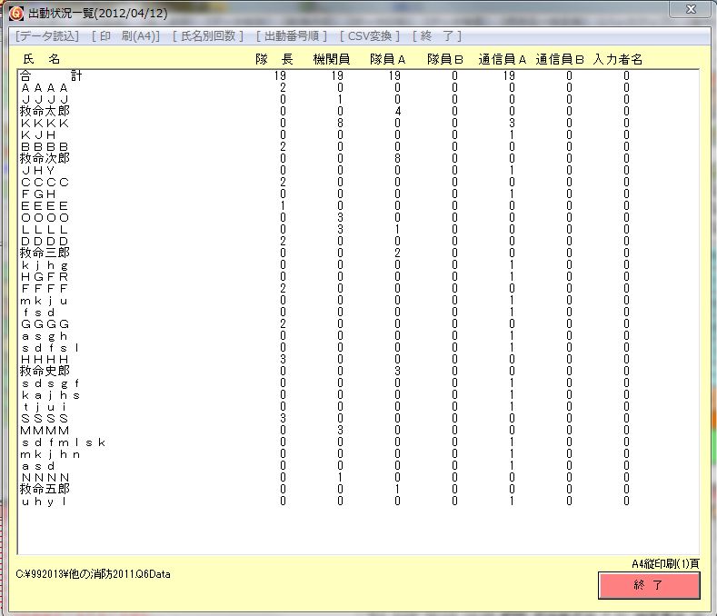 出動データごとの隊員等のデータを見ることができます。 下の表は[氏名別回数]ボタンを押した状態です