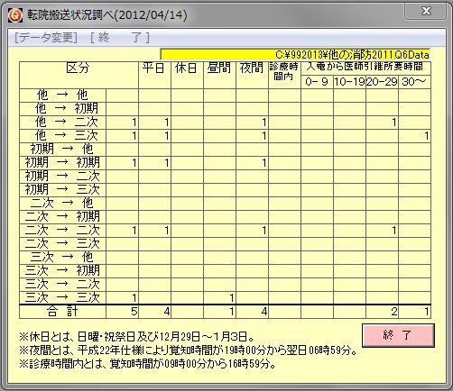 転院搬送で何次の医療機関から何次の医療機関に搬送したか、その件数が分かります。