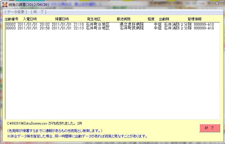 先発隊が帰署するまでに通報がある場合が続発出動とみなします。そのため、併合データで他署とのデータが混在する場合は同一時間帯に出動がある場合に、続発とみなします。(管理情報でコードが異なるときです)
