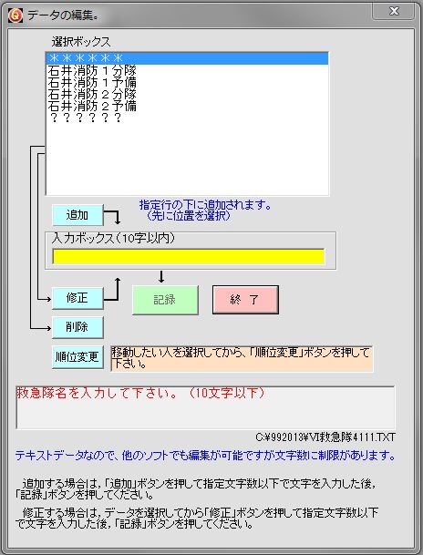 データを新たに追加する場合は、追加位置を選択してから「追加」ボタンを押し、入力ボックス内に指定の文字の範囲で全角で入力して「記録」ボタンを押す。