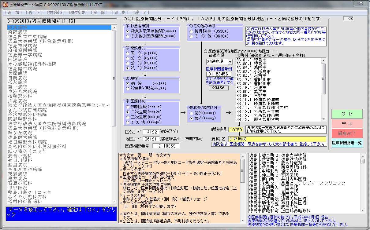| メモ帳等のテキストファイル編集ソフトで、編集することも可能です。 データ例 "11131","3680110015","徳島大学病院" これが、1医療機関のデータです。 医療機関データは、従来の5桁の「区分コード」(告示別・開設者別・規模・医療体制・管区)の他に10桁の医療機関固有番号が付くようになります。 医療機関固有番号は「Q助6」では、地区コードと病院番号を登録するようにしました。 地区コードは、2桁の都道府県コードと3桁の市町村コード及び5桁の病院番号です。 市町村コードは、旧来の市町村の区分けを参考としており医療機関一覧表では細分化されていない市町村に対し3桁の市町村コードを付加しております。これは、市町村リストから町村を選択することにより同じ番号でも枝番が付くようになります。 例えば、上記の名西郡石井町と名西郡神山町では[36 12]と表示されていますが、神山町を選択すると地区コードは[36122]と表示されます。(石井町は[36121]です) また、医療機関一覧表を見てみますと国立病院等の場合に医療機関の所在地コードに通常の市町村コード以外に[70][80]等のコードが付いています。 例 徳島大学病院 の場合 「全医療機関一覧表」67頁から 徳島市内で[80-10015]となっています。 地区コード、徳島県[36]、所在地コード[80]で最初の80だから[1]となり[36801]とします。 ※保険医療機関の「医療機関コード」調べ方 @地方厚生(支)局ホームページのトップ画面にある「業務内容」へアクセスする。" A「保険医療機関・保険薬局関係」へアクセスする。 B地方厚生(支)局管内の「保険医療機関・保険薬局の指定一覧」が掲載されている。" 医療機関編集画面の右側ボタンに「医療機関指定一覧」ボタンが有り、これでホームページの初期画面が表示され、各都道府県の医療機関指定一覧を見ることが出来ます。 右下に医療機関のリストを設けました。これは、平成24年9月1日の医療機関リストで配布消防本部の地名のみを医療機関指定一覧からドラッグアンドドロップでコピーして不要なものをカットしたものですが、なじみの無い名称のためカット位置によっては必要な名称が表示されていないことがあります。その際は、選択後に病院名を修正し登録して下さい。また、一覧で地域の順番が不規則な場合に見落としているものもあります。その場合は、医療機関指定一覧から探して登録して下さい。 ※ホームページの医療機関一覧リストの下段に、**Iryou.csv ファイルを順次登録していきますので、まだ無い消防本部の方はお申し出下さい。 医療機関番号は、 ・青森県、富山県、京都府、島根県、愛媛県、香川県は医療機関一覧表に、[01, 2345, 6]と表記されています。 ・福井県、大阪府、徳島県は医療機関一覧表に、[01-23456]と表記されています。 ・宮城県、福島県、千葉県、三重県は医療機関一覧表に、[0123456]と表記されています。 ・高知県は医療機関一覧表に、[012 345.6]と表記されています。 ・秋田県、長野県、熊本県、沖縄県は医療機関一覧表に、[01・2345・6]と表記されていま す。 ・栃木県、埼玉県、神奈川県、新潟県、静岡県、愛知県、奈良県、鳥取県、岡山県、福岡県、長崎県は医療機関一覧表には[012,345,6]と表記されています。 いずれも下5桁を病院番号とし、病院名は医療機関名称で統一して下さい。